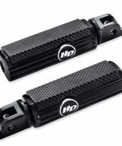 Diese Fußrasten von Harley-Davidson sind durch Ihre Kurven definiert. Die komplette Kollektion der Steuerelemente verfügt über ein reichhaltiges schwarzes Finish. Das Design beinhaltet ein Design aus texturiertem schwarzen Gummi, das mit tiefen Längslinien und einem zeitgenössischen Harley-Davidson Logo ausgestattet ist.