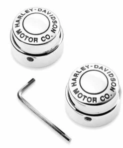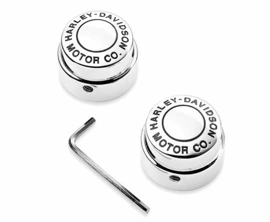 Gegossene und verchromte Kappen mit schwarzem “Harley-Davidson Motor Co.” Logo.